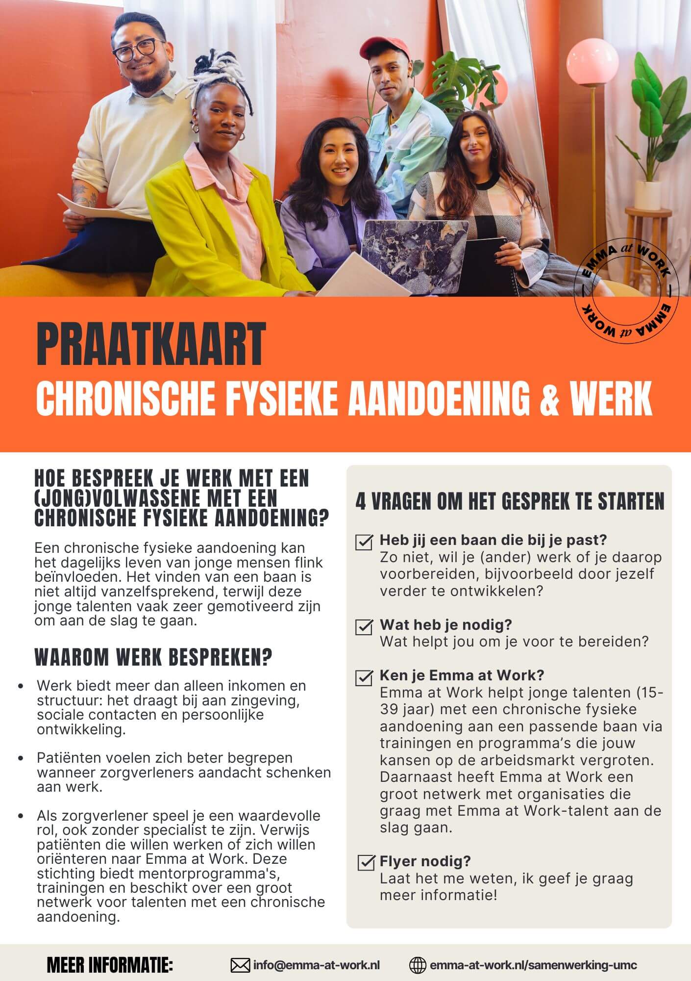 Als HR-directeur of medisch specialist in een umc kun je een belangrijke rol spelen in het toekomstperspectief van jonge talenten met een chronische fysieke aandoening. Met de flyer ‘Een chronische fysieke aandoening en leuk werk? Dat kan!’ bied je hen een toegankelijke route naar kansen op de arbeidsmarkt via Emma at Work.